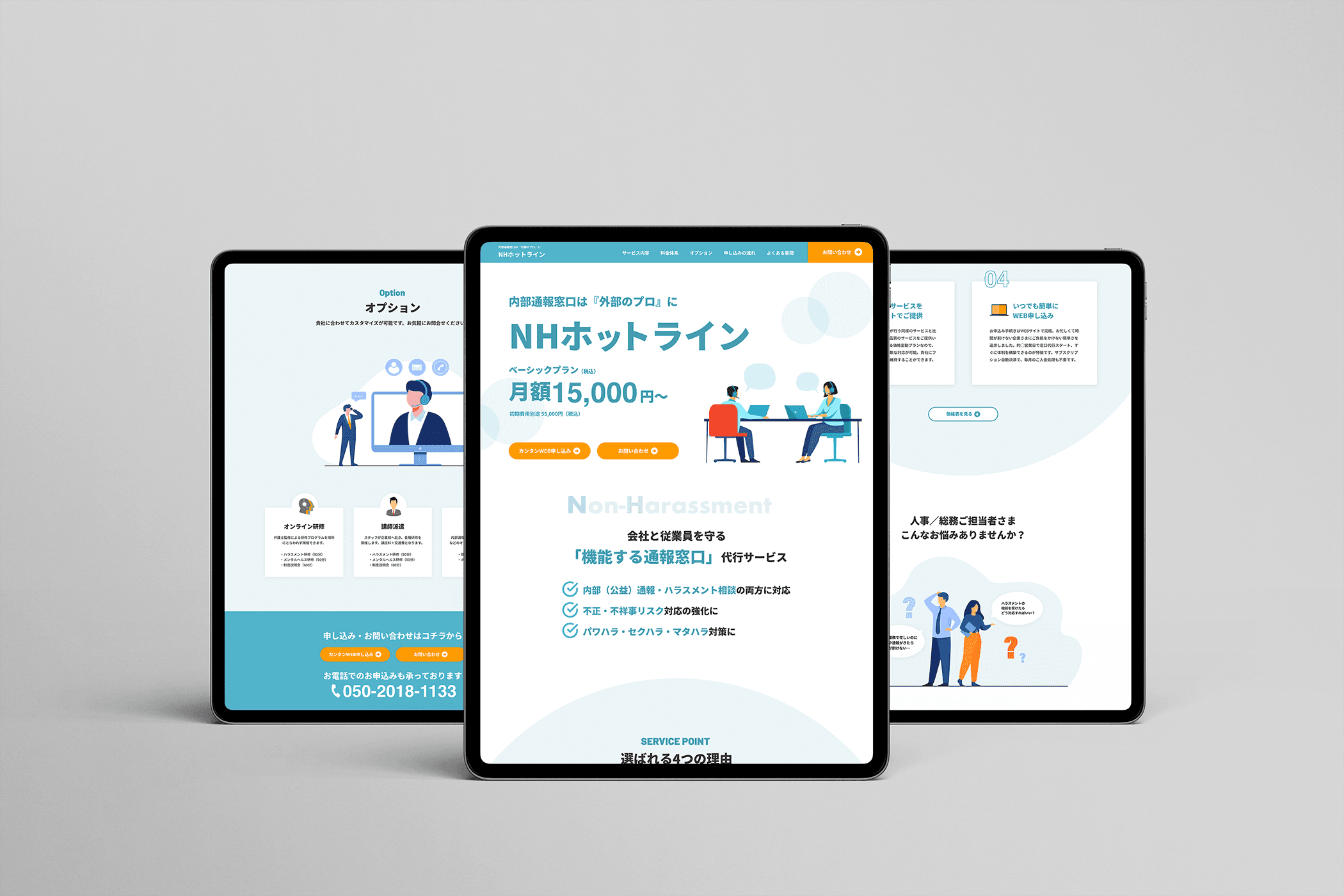 バックオフィス業務代行を行なっているサザンクルーさまからハラスメント通報窓口のLPのご依頼をいただきました。新規での作成であったので、伝えたいことや掲載したい要素などをお伺いしデザインを作り上げました。(提案時のデザインのため、変更されている可能性があります)